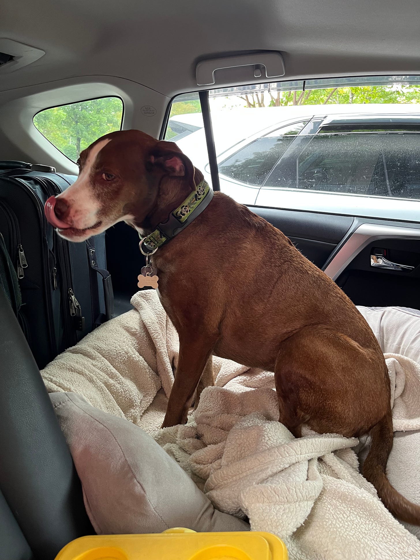 I set up her bed in the back seat where she has plenty of room to lounge. She mostly sleeps while we drive and rarely takes in any of the sights.