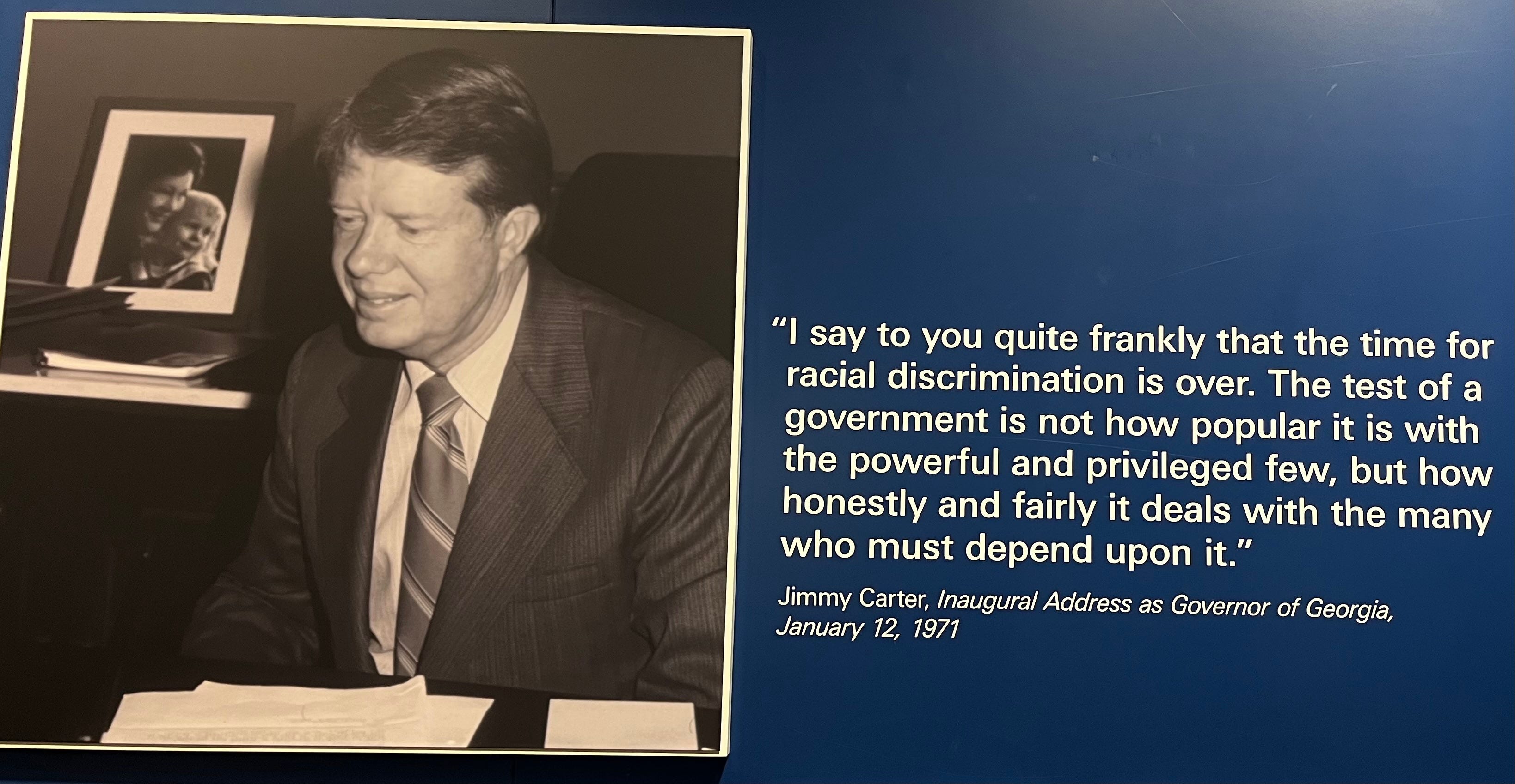 "I say to you quite frankly that the time for racial discrimination is over. The test of a government is not how popular it is with the powerful and privileged few, but how honestly and fairly it deals with the many who must depend upon it," Carter said in January 1971.