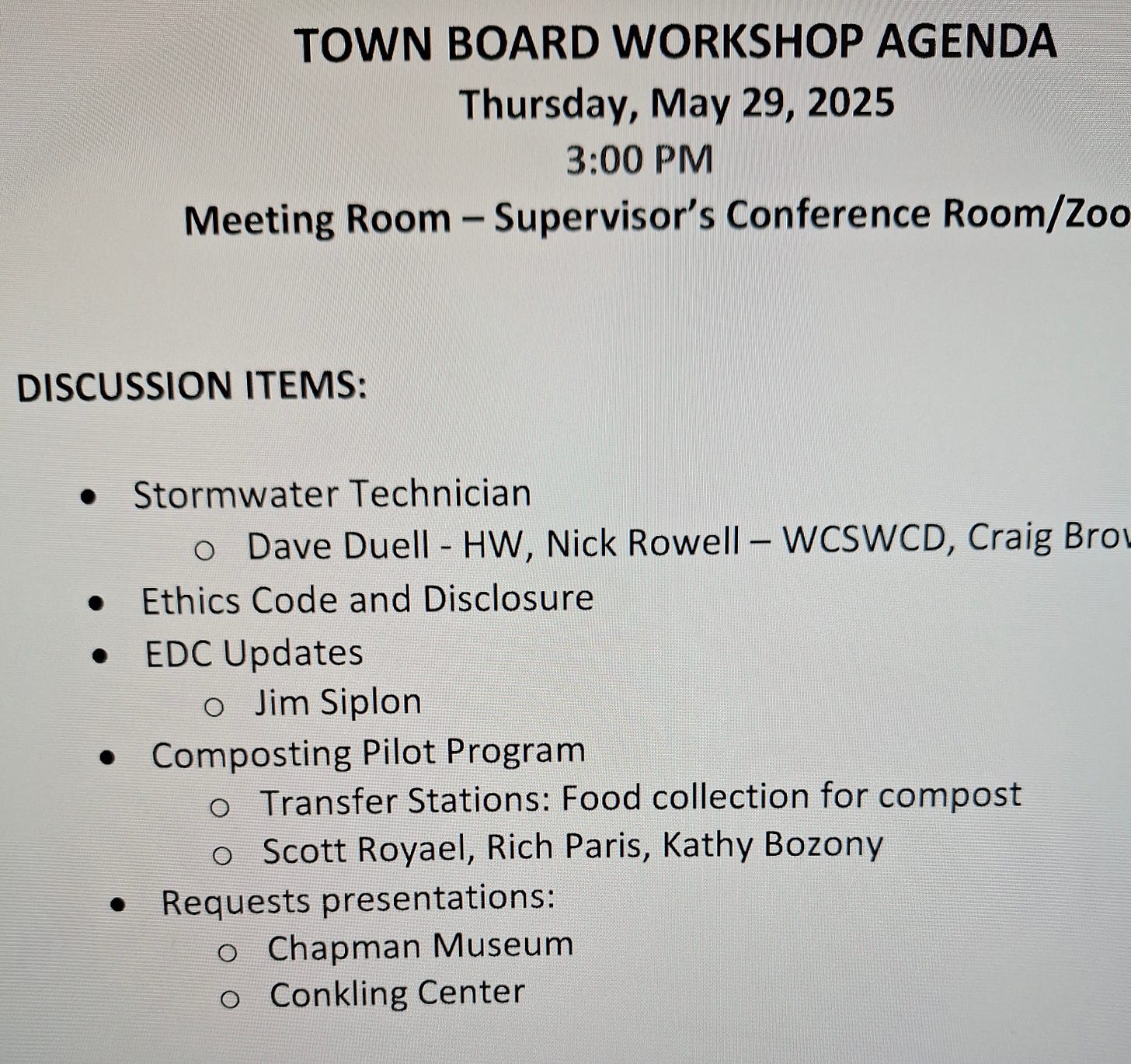 There is a workshop scheduled for Thursday at 3 p.m. in the supervisor's conference room next to the supervisor's office at the Queensbury Town Hall with one of the items to be discussed “ethics code and disclosure.”