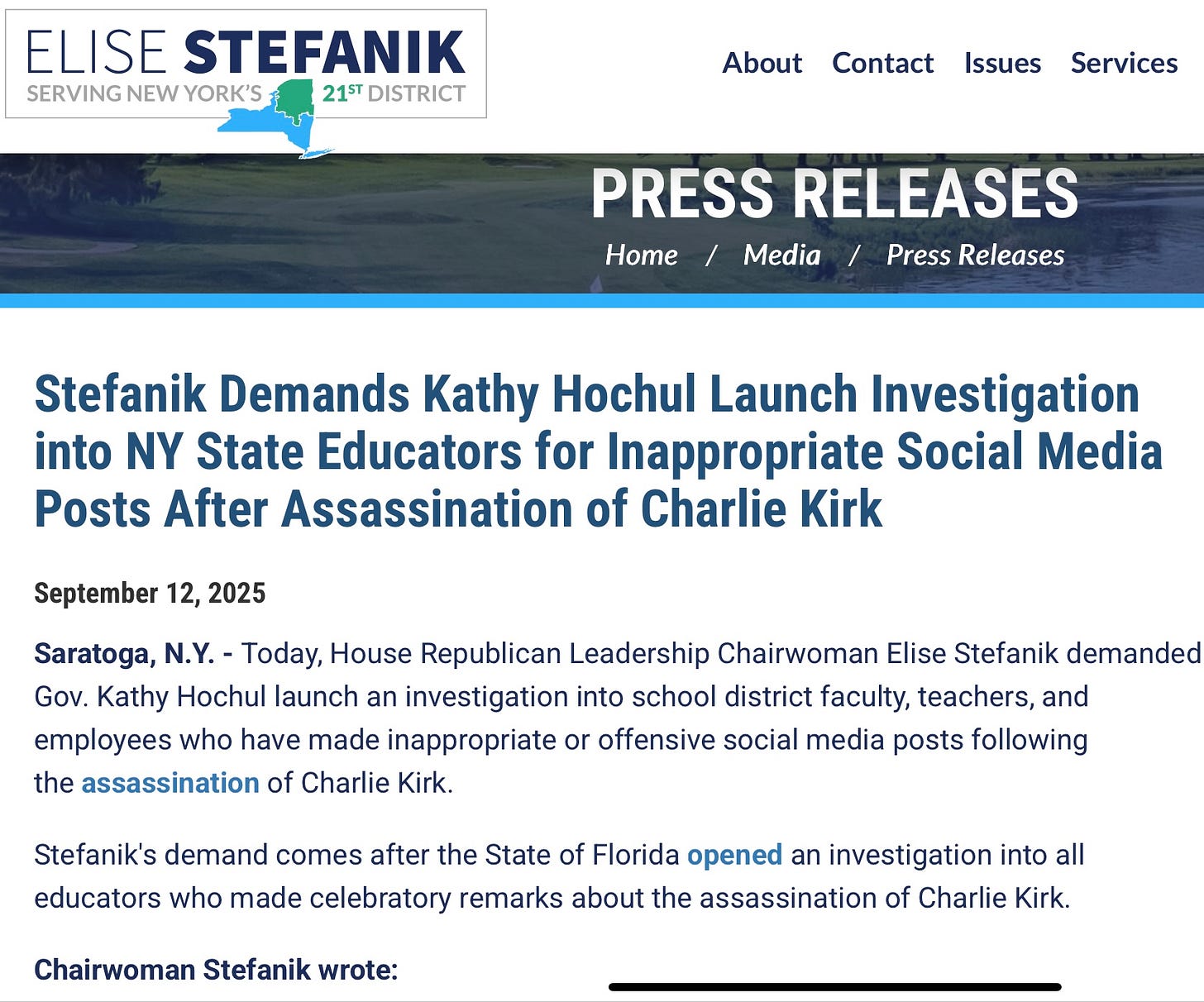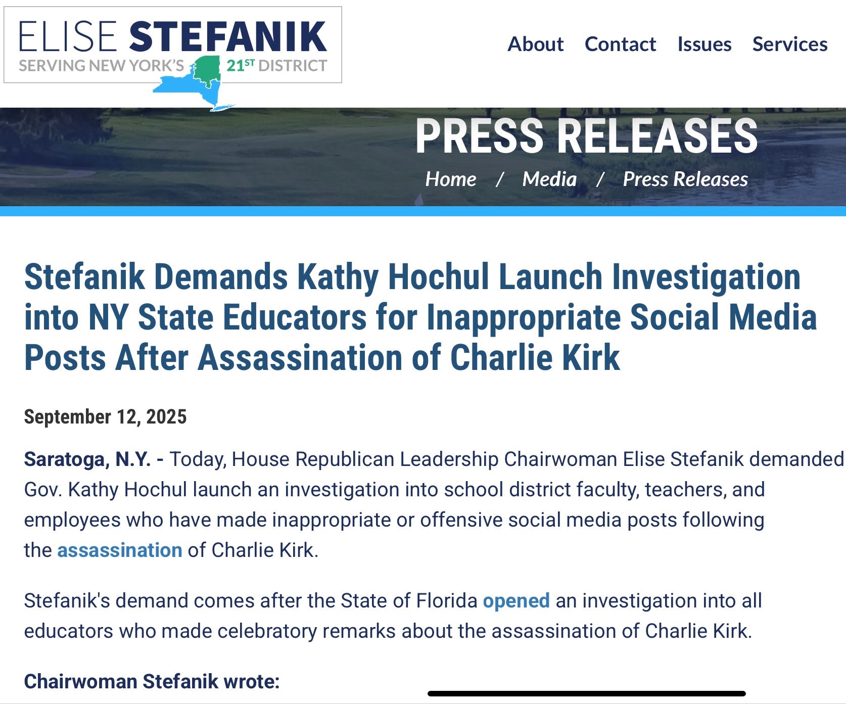 "It has come to my attention that in the wake of the tragic and horrific murder of Charlie Kirk, a number of public school educators across New York State have made deeply inappropriate, offensive, and unprofessional comments on social media platforms," Stefanik wrote in her letter to Hochul. "While these individuals represent a very small minority, their conduct is disturbing and inconsistent with the high standards expected of educators in New York State. Other states have publicly announced a review but unsurprisingly New York has failed to do so under your (Hochul) leadership."