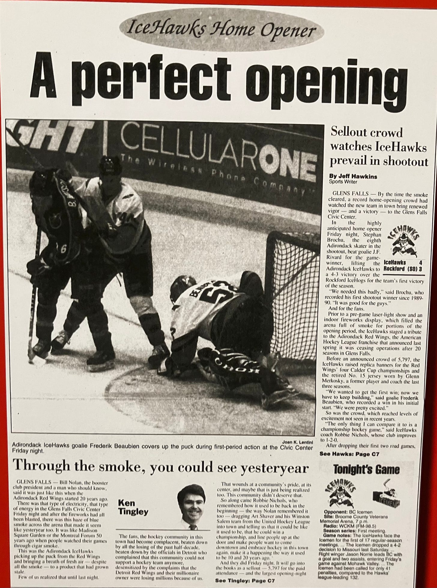 I was honored to have an old clip of one of my columns covering the home opener of the Adirondack IceHawks on display.